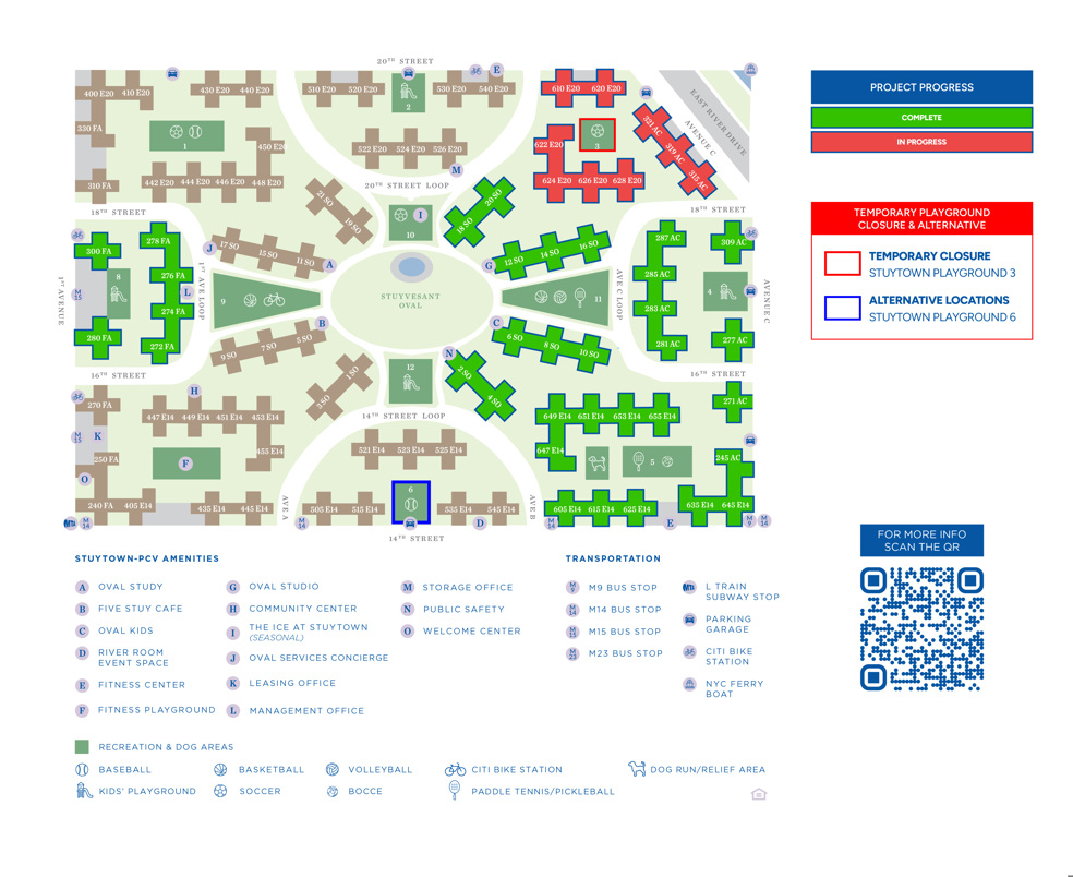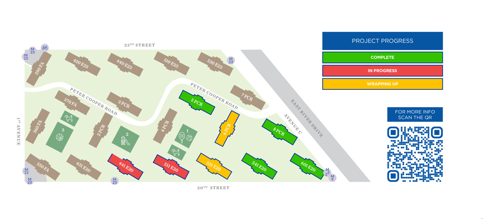 Local Law 11 is a city-wide safety program requiring property owners to inspect and maintain building facades taller than six stories. In accordance with Local Law 11, Beam must begin a long-term construction project in StuyTown and Peter Cooper Village for all buildings. Construction involves erecting sidewalk bridging (sheds) as work progresses. A site safety lead and an engineer will be onsite at all times during work hours.