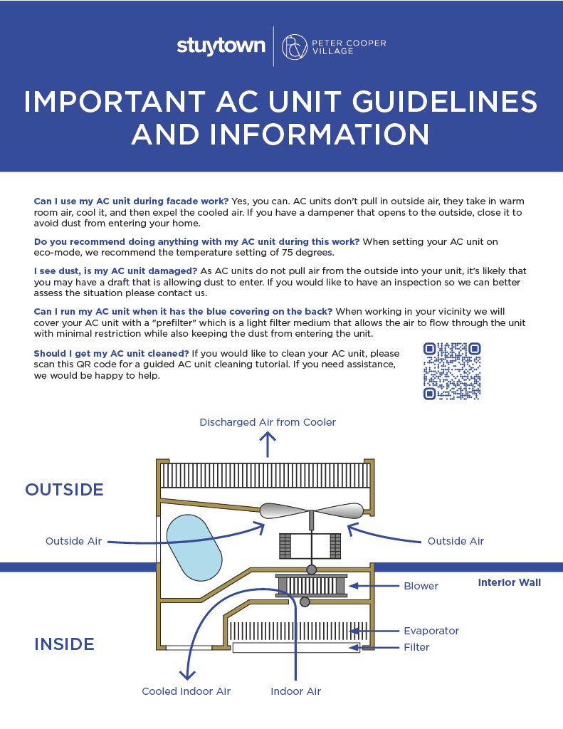 The contractor will cover air conditioners with blue filter protection per construction industry standards. This protection will remain in place during the entire repair process for your apartment line and will be removed only once all repairs are completed.